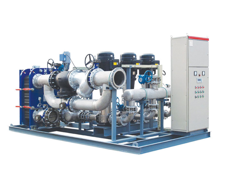 換熱機(jī)組的構(gòu)成及工作原理?yè)Q熱機(jī)組是集成板式換熱器、循環(huán)泵、補(bǔ)水泵、電控柜、溫控裝置、各種傳感器、熱量計(jì)、溫度計(jì)、壓力表、管路和閥1門等于- -體,并組裝在公共底座上的熱交換成套組合裝置。一次側(cè)熱源(蒸汽、高溫水等),經(jīng)過(guò)除污器過(guò)濾后,進(jìn)入板式換熱器與二次側(cè)循環(huán)水進(jìn)行熱交換,然后返回一次側(cè)回水管網(wǎng)。二次側(cè)循環(huán)水經(jīng)過(guò)除污器過(guò)濾、循環(huán)泵加壓后,進(jìn)入板式換熱器與一次側(cè)熱源進(jìn)行熱交換,然后進(jìn)入二次側(cè)供水管...